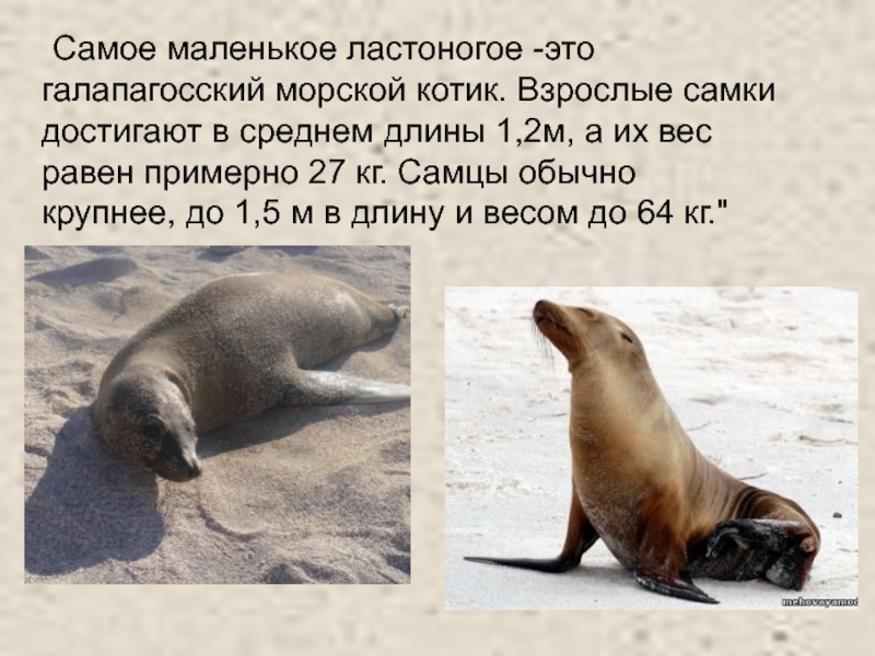 Слайд 19 Самое маленькое ластоногое -это галапагосский морской котик. Взрослые самки достигают в