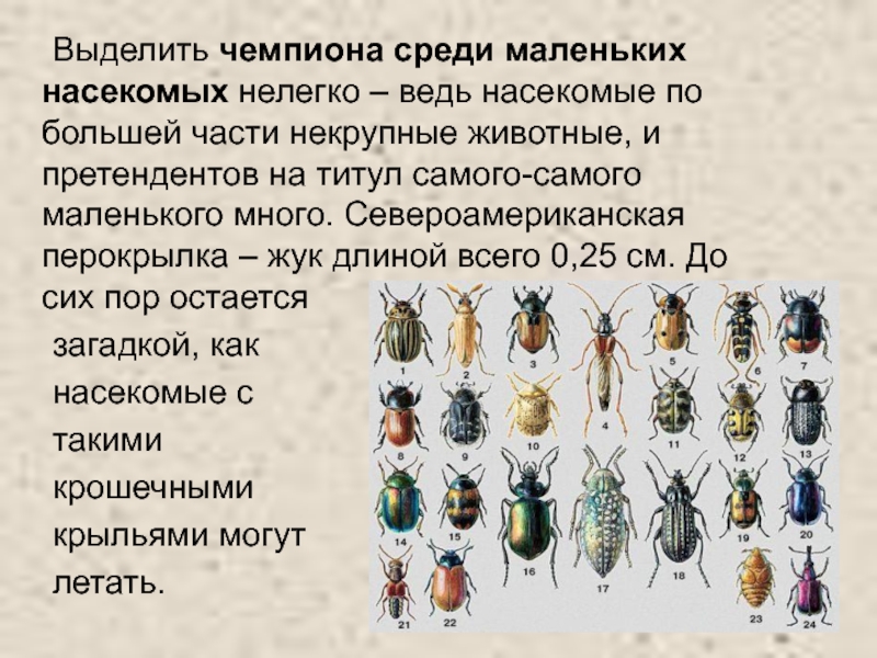 части некрупные животные, и претендентов на титул самого-самого маленького много. Североамериканская перокрылка – жук длиной всего 0,25 см. До сих пор остается