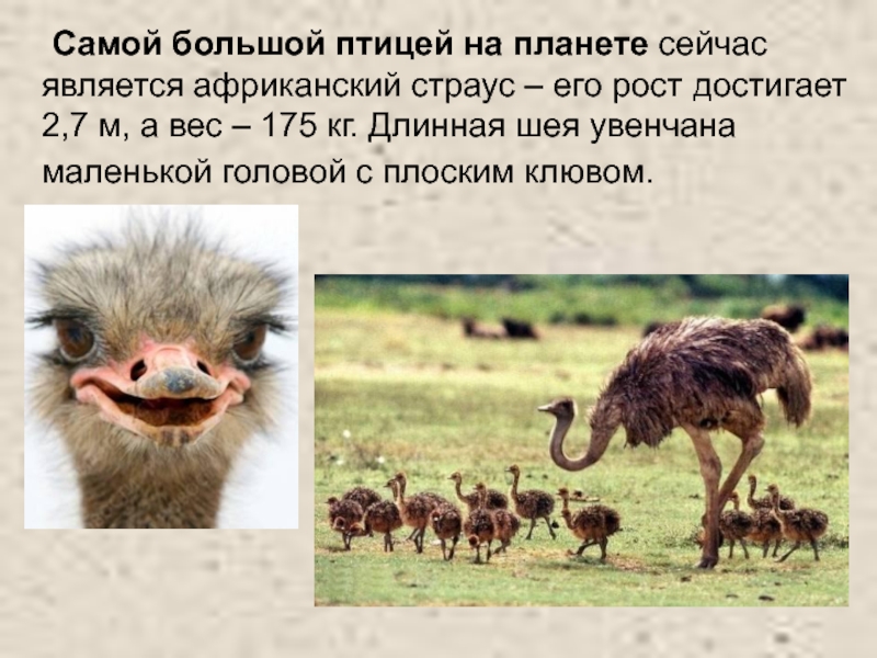 Слайд 20 Самой большой птицей на планете сейчас является африканский страус – его