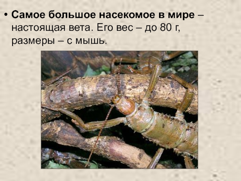Слайд 36Самое большое насекомое в мире – настоящая вета. Его вес –