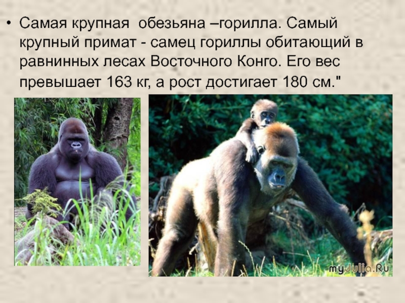 Слайд 16Самая крупная обезьяна –горилла. Самый крупный примат - самец гориллы обитающий