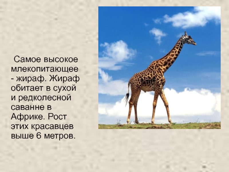 Слайд 12 Самое высокое млекопитающее- жираф. Жираф обитает в сухой и редколесной саванне
