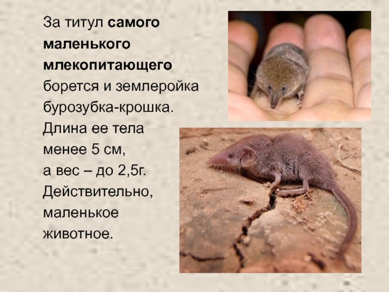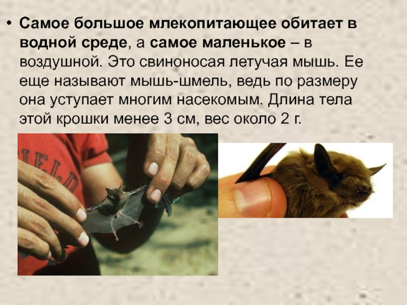 Слайд 8Самое большое млекопитающее обитает в водной среде, а самое маленькое –