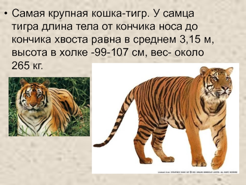 Слайд 14Самая крупная кошка-тигр. У самца тигра длина тела от кончика носа