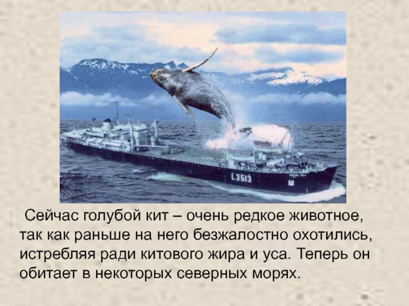 Слайд 5 Сейчас голубой кит – очень редкое животное, так как раньше на