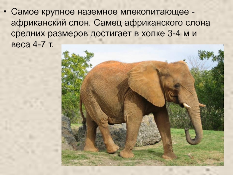 Слайд 6Самое крупное наземное млекопитающее - африканский слон. Самец африканского слона средних