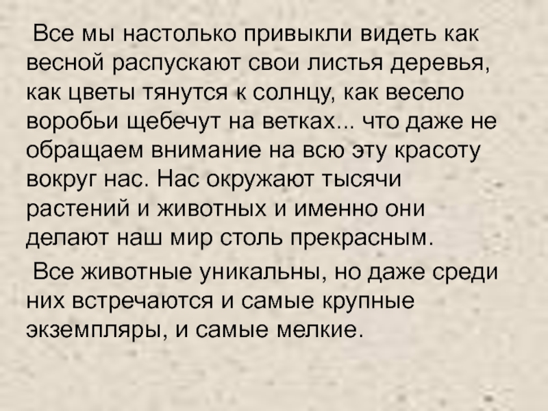 как цветы тянутся к солнцу, как весело воробьи щебечут на ветках... что даже не обращаем внимание на всю эту красоту вокруг нас. Нас окружают тысячи растений и животных и именно они делают наш мир столь прекрасным.