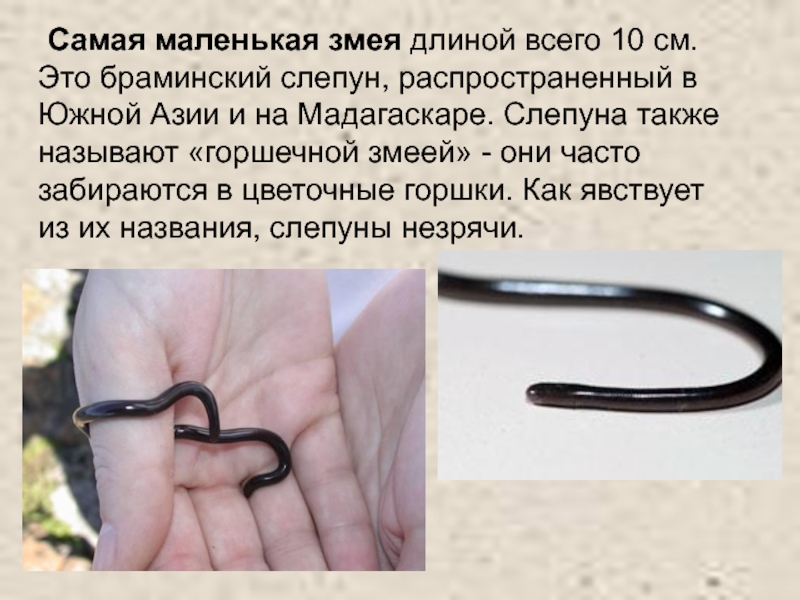 Слайд 35 Самая маленькая змея длиной всего 10 см. Это браминский слепун, распространенный