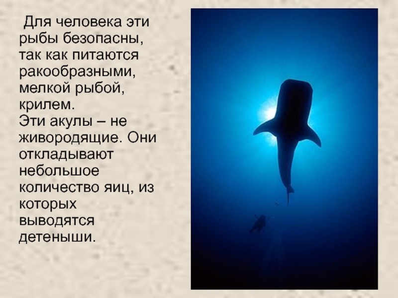 Слайд 27 Для человека эти рыбы безопасны, так как питаются ракообразными, мелкой рыбой,