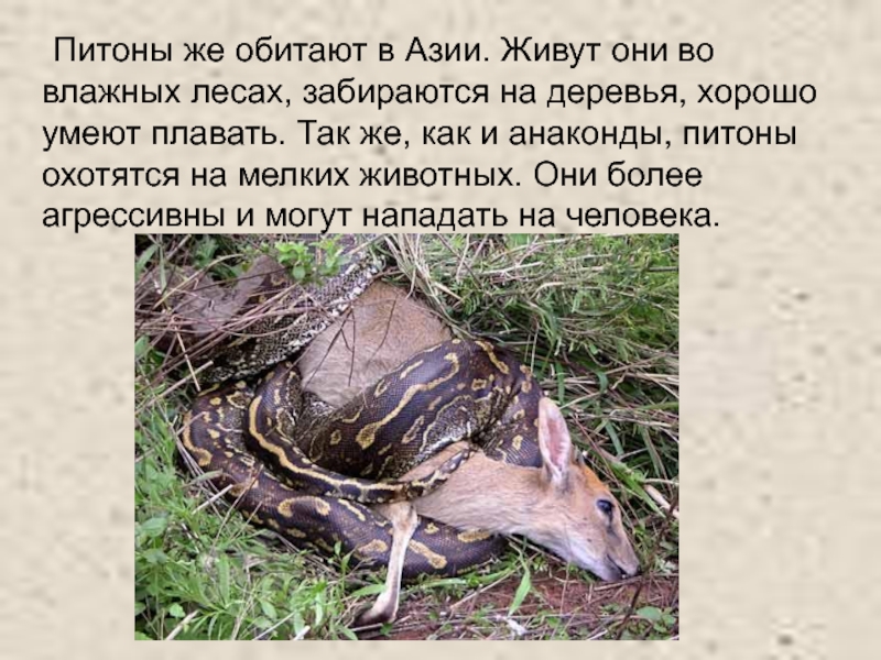 Слайд 32 Питоны же обитают в Азии. Живут они во влажных лесах, забираются