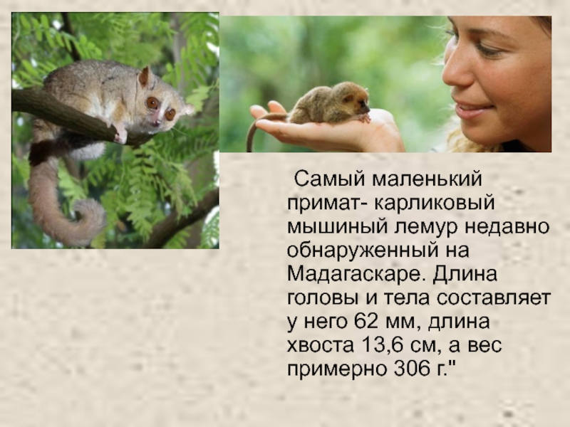 Слайд 17 Самый маленький примат- карликовый мышиный лемур недавно обнаруженный на Мадагаскаре. Длина