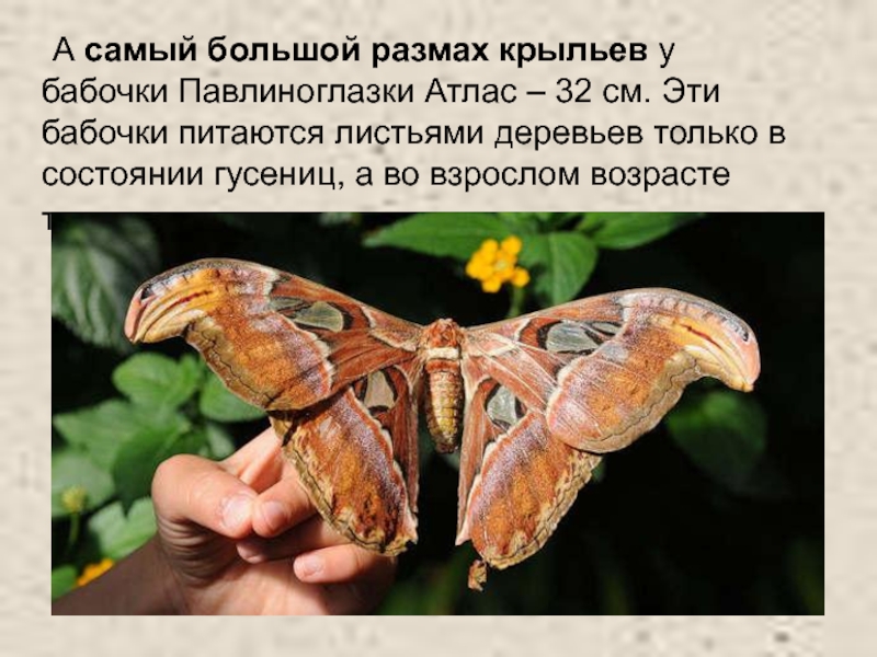 Слайд 37 А самый большой размах крыльев у бабочки Павлиноглазки Атлас – 32