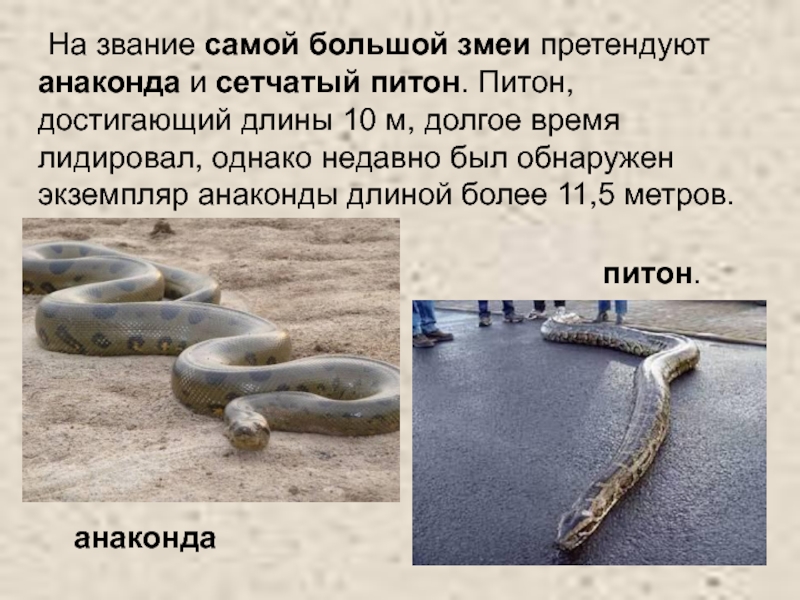 достигающий длины 10 м, долгое время лидировал, однако недавно был обнаружен экземпляр анаконды длиной более 11,5 метров.