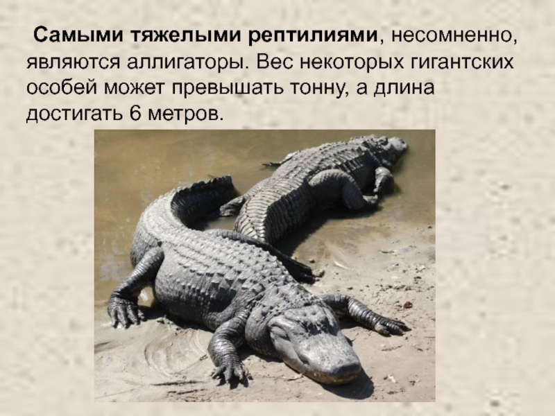 Слайд 34 Самыми тяжелыми рептилиями, несомненно, являются аллигаторы. Вес некоторых гигантских особей может
