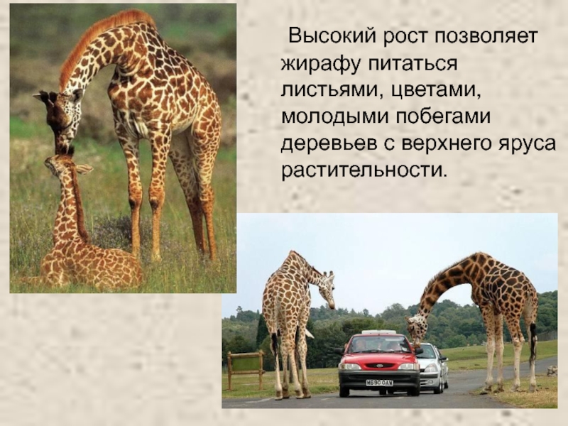 Слайд 13 Высокий рост позволяет жирафу питаться листьями, цветами, молодыми побегами деревьев с