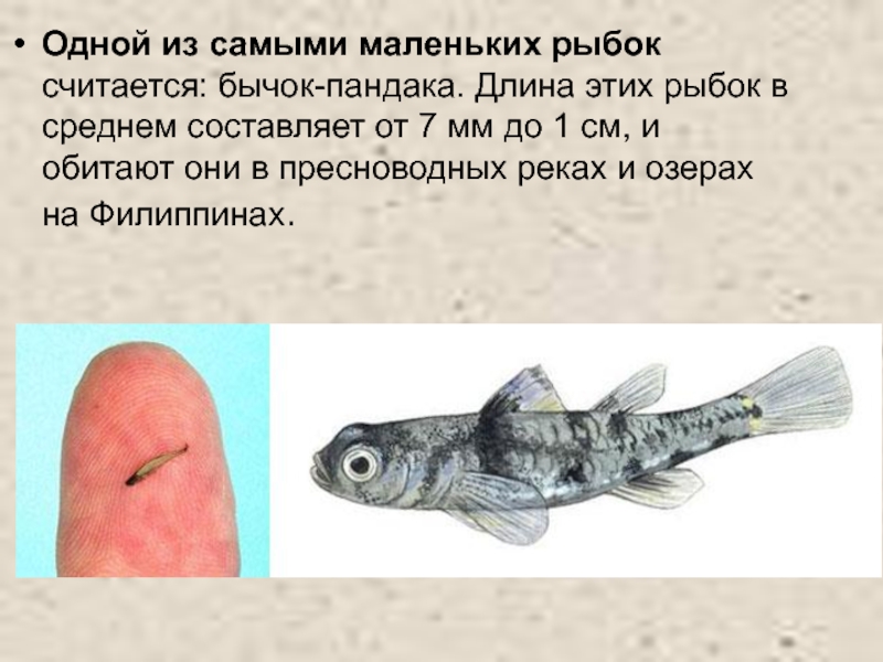 Слайд 29Одной из самыми маленьких рыбок считается: бычок-пандака. Длина этих рыбок в