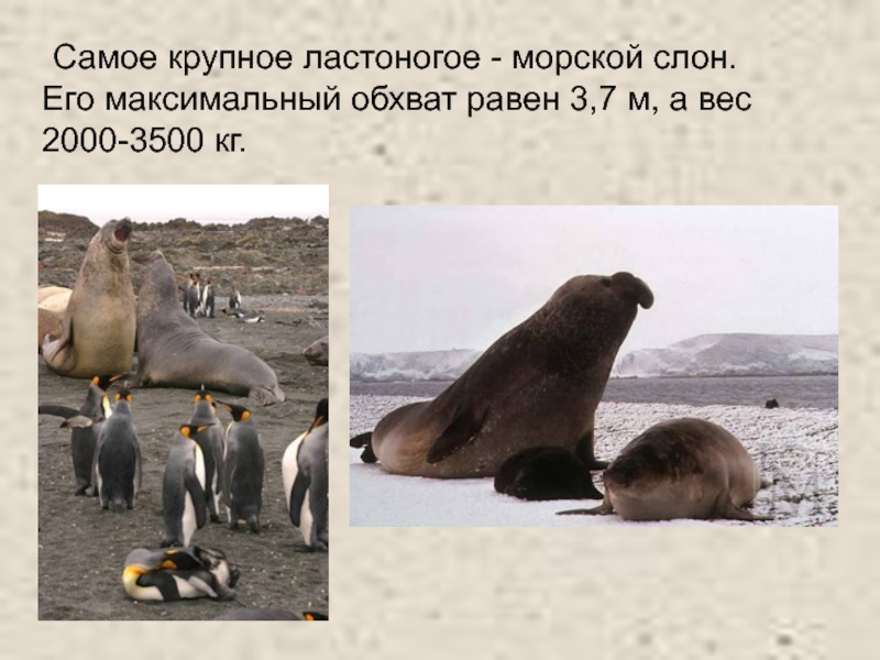 Слайд 18 Самое крупное ластоногое - морской слон. Его максимальный обхват равен 3,7