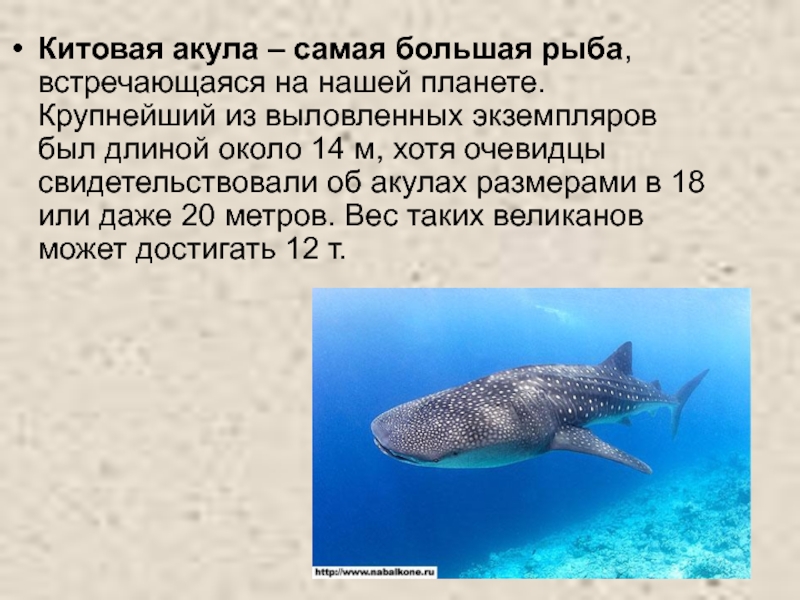 Слайд 25Китовая акула – самая большая рыба, встречающаяся на нашей планете. Крупнейший