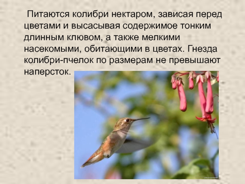 клювом, а также мелкими насекомыми, обитающими в цветах. Гнезда колибри-пчелок по размерам не превышают наперсток.