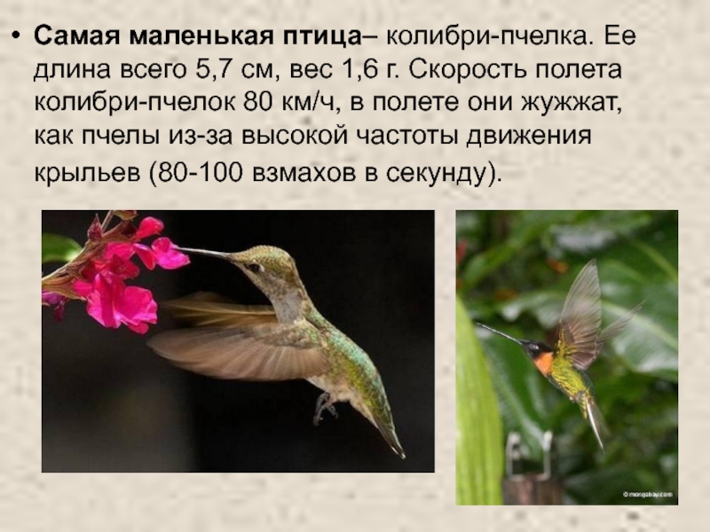 Слайд 23Самая маленькая птица– колибри-пчелка. Ее длина всего 5,7 см, вес 1,6
