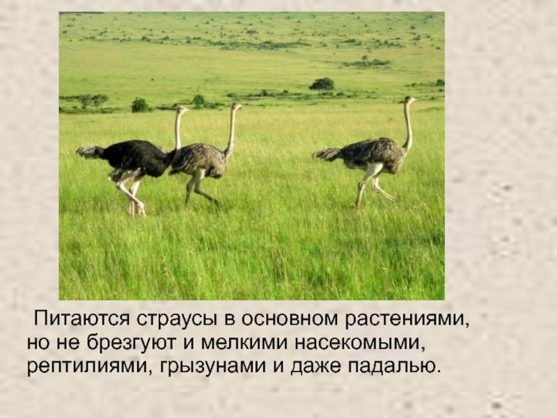 Слайд 22 Питаются страусы в основном растениями, но не брезгуют и мелкими насекомыми,