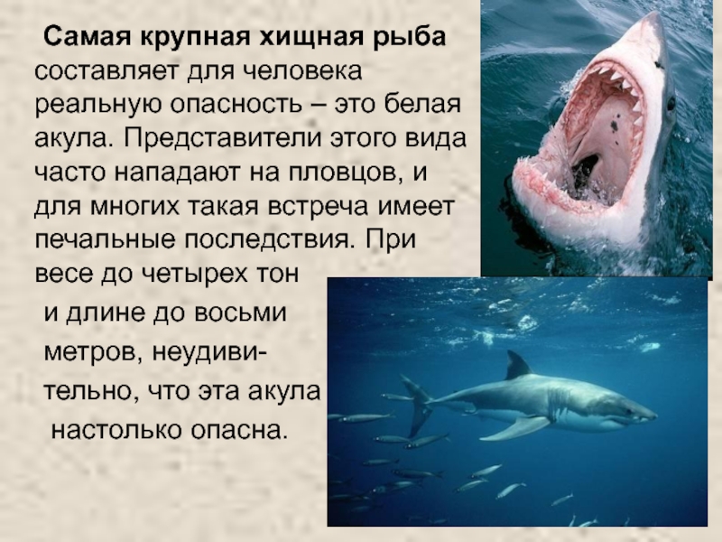 белая акула. Представители этого вида часто нападают на пловцов, и для многих такая встреча имеет печальные последствия. При весе до четырех тон