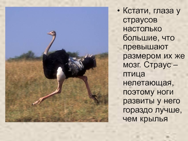 Слайд 21Кстати, глаза у страусов настолько большие, что превышают размером их же