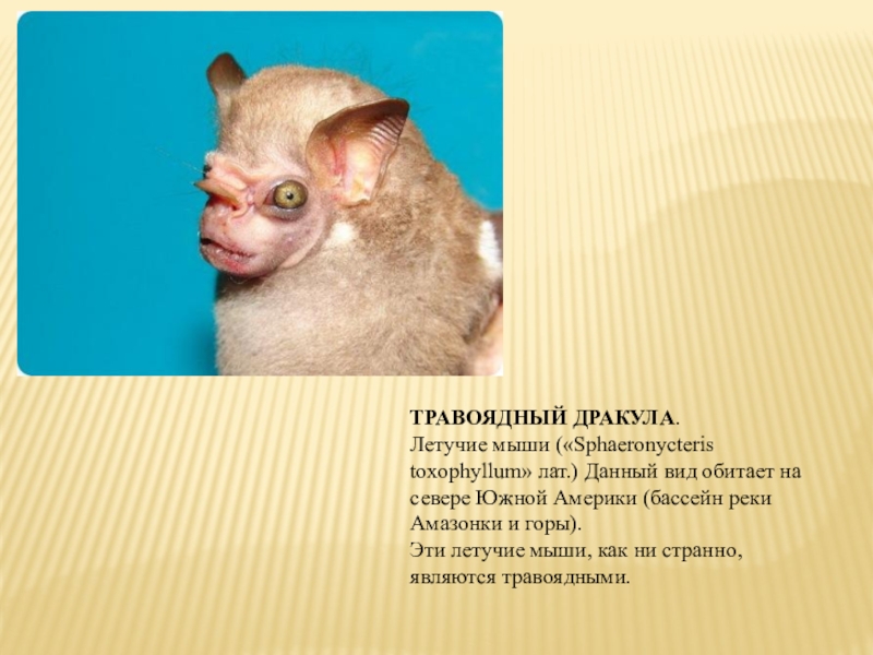 ТРАВОЯДНЫЙ ДРАКУЛА. Летучие мыши («Sphaeronycteris toxophyllum» лат.) Данный вид обитает на севере Южной Америки (бассейн реки Амазонки