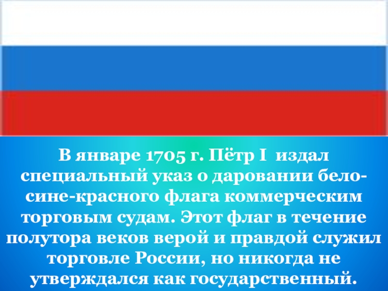 Государственный флаг России представляет собой прямоугольное полотнище из трех полос: верхней – белого, среднего – синего и нижней- красного цвета.
