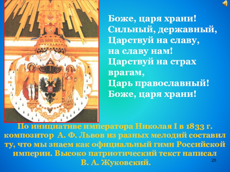 композитор А. Ф. Львов из разных мелодий составил ту, что мы знаем как официальный гимн Российской империи. Высоко патриотический текст написал