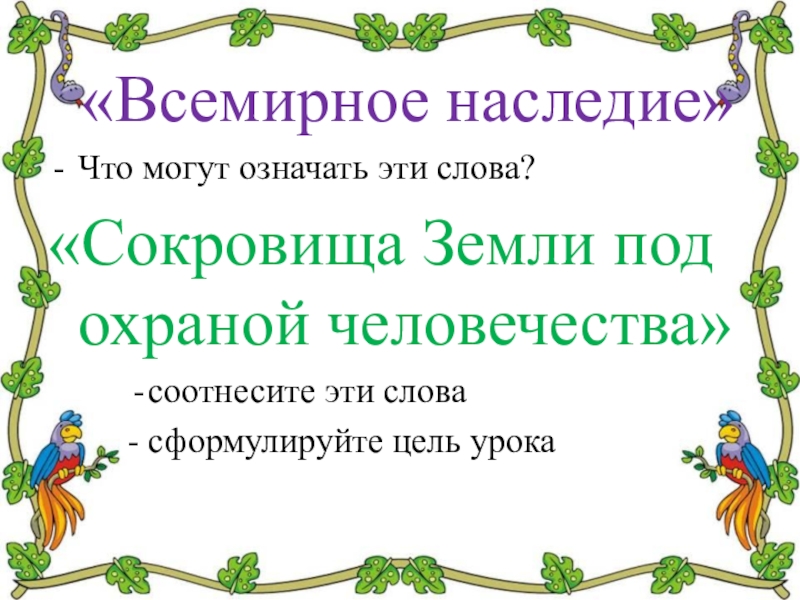 «Всемирное наследие»Что могут означать эти слова?«Сокровища Земли под охраной человечества»соотнесите эти слова- сформулируйте цель урока