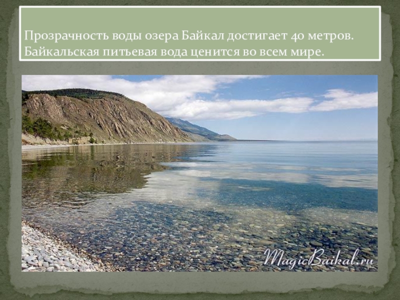Слайд 26Прозрачность воды озера Байкал достигает 40 метров. Байкальская питьевая вода ценится