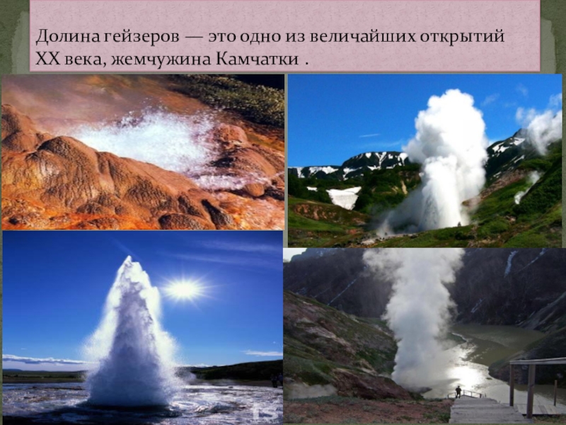 Слайд 28Долина гейзеров — это одно из величайших открытий ХХ века, жемчужина