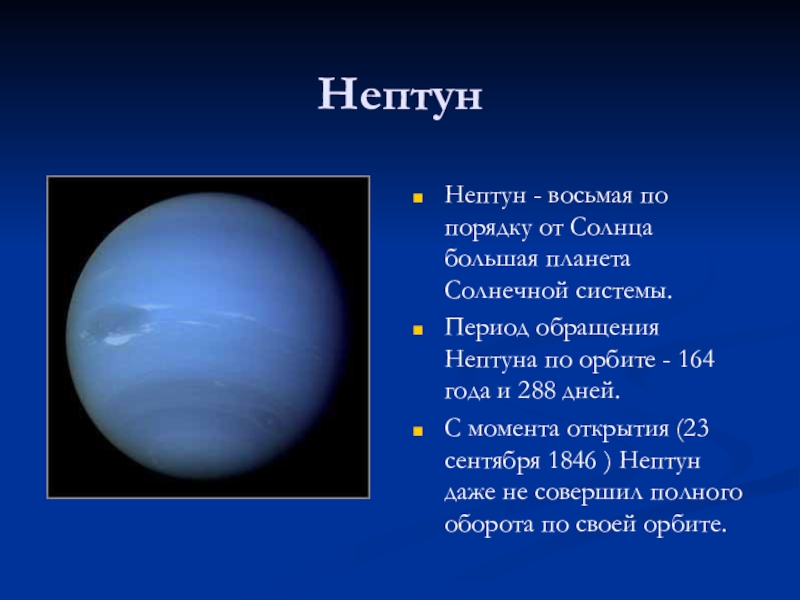 НептунНептун - восьмая по порядку от Солнца большая планета Солнечной системы. Период обращения Нептуна по орбите -