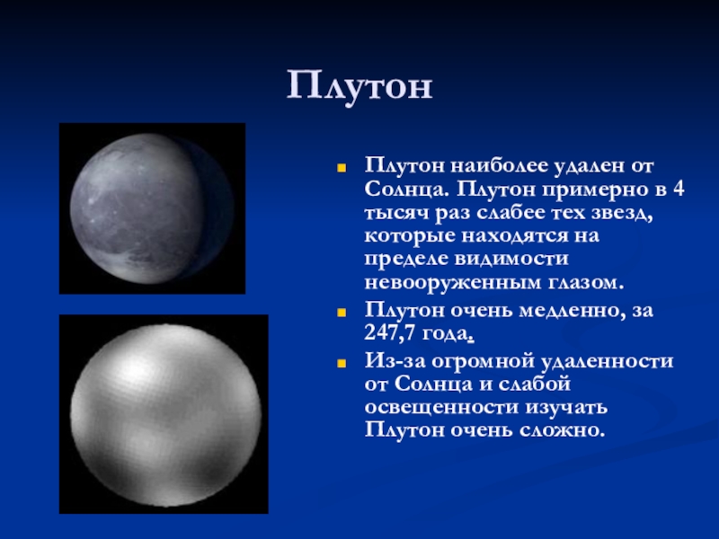 ПлутонПлутон наиболее удален от Солнца. Плутон примерно в 4 тысяч раз слабее тех звезд, которые находятся на
