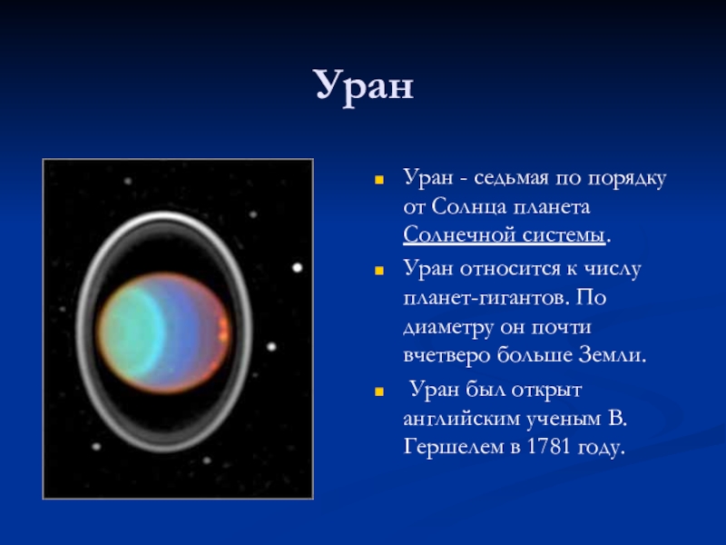 УранУран - седьмая по порядку от Солнца планета Солнечной системы. Уран относится к числу планет-гигантов. По диаметру