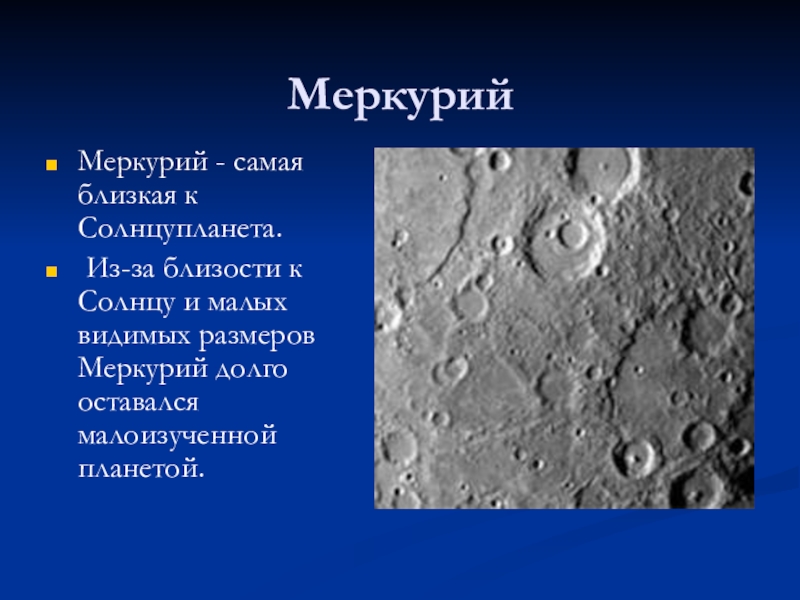 МеркурийМеркурий - самая близкая к Солнцупланета. Из-за близости к Солнцу и малых видимых размеров Меркурий долго оставался