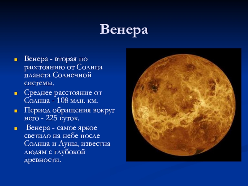 ВенераВенера - вторая по расстоянию от Солнца планета Солнечной системы. Среднее расстояние от Солнца - 108 млн.