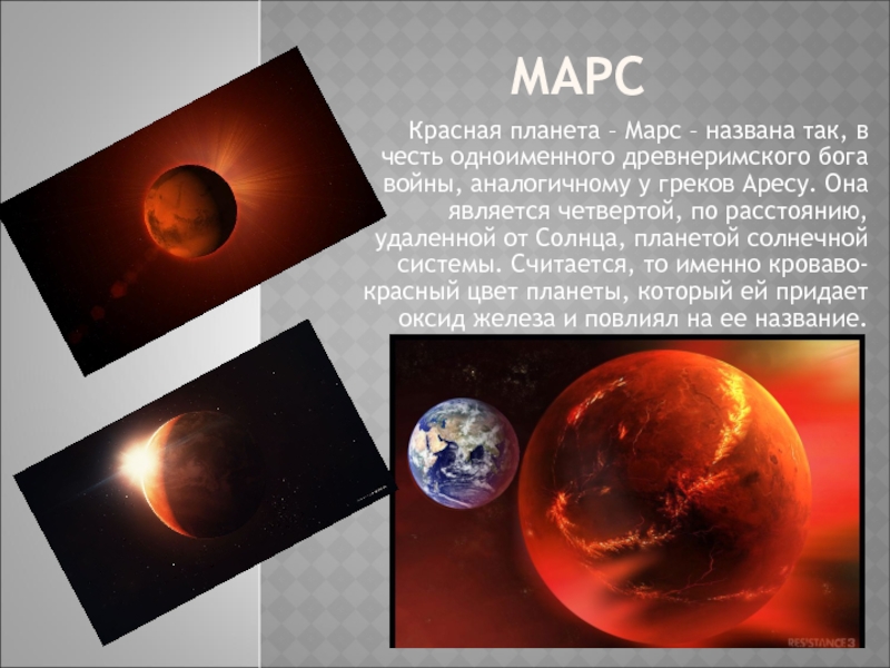 бога войны, аналогичному у греков Аресу. Она является четвертой, по расстоянию, удаленной от Солнца, планетой солнечной системы. Считается, то именно кроваво-красный цвет планеты, который ей придает оксид железа и повлиял на ее название.