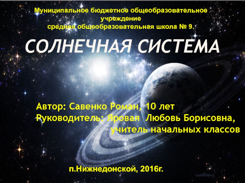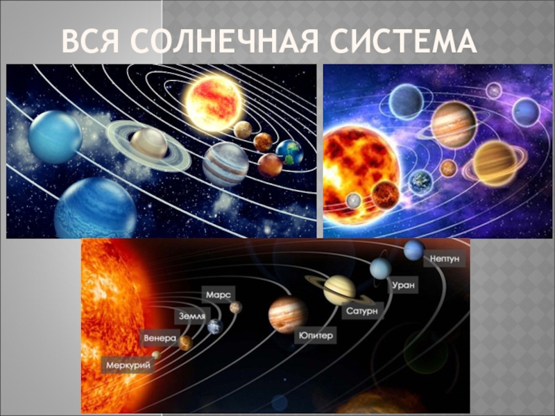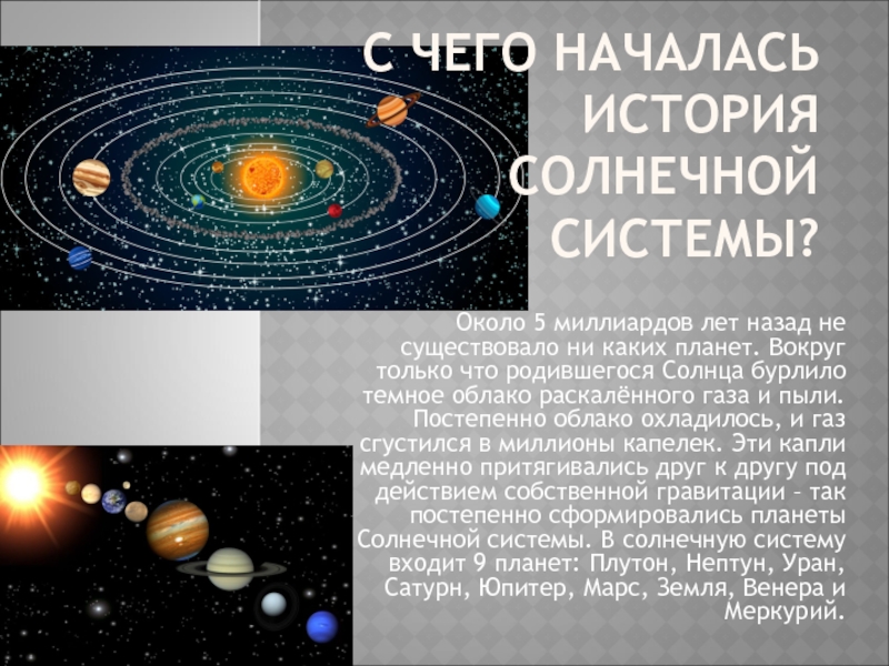 существовало ни каких планет. Вокруг только что родившегося Солнца бурлило темное облако раскалённого газа и пыли. Постепенно облако охладилось, и газ сгустился в миллионы капелек. Эти капли медленно притягивались друг к другу под действием собственной гравитации – так постепенно сформировались планеты Солнечной системы. В солнечную систему входит 9 планет: Плутон, Нептун, Уран, Сатурн, Юпитер, Марс, Земля, Венера и Меркурий.