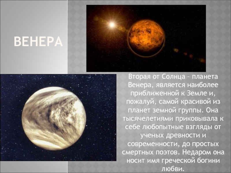 и, пожалуй, самой красивой из планет земной группы. Она тысячелетиями приковывала к себе любопытные взгляды от ученых древности и современности, до простых смертных поэтов. Недаром она носит имя греческой богини любви.