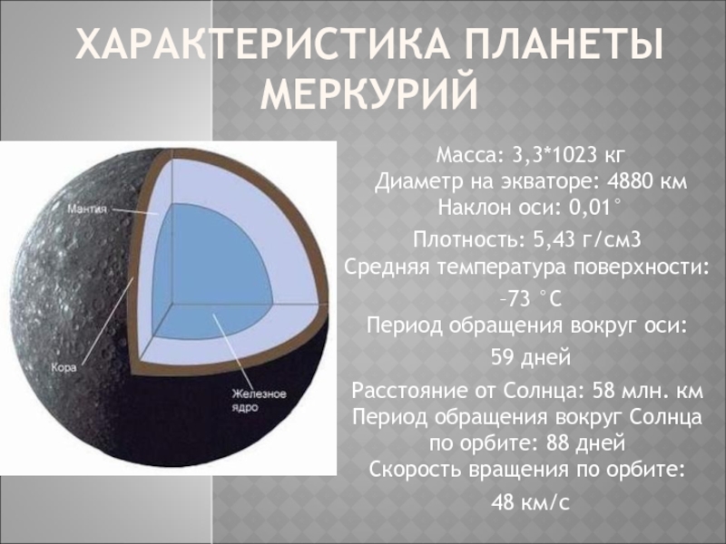Слайд 6ХАРАКТЕРИСТИКА ПЛАНЕТЫ МЕРКУРИЙ