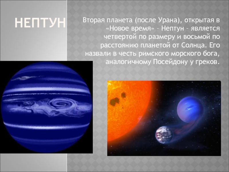является четвертой по размеру и восьмой по расстоянию планетой от Солнца. Его назвали в честь римского морского бога, аналогичному Посейдону у греков.