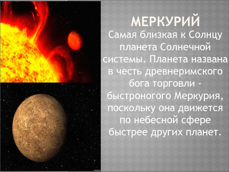 Самая близкая к Солнцу планета Солнечной системы. Планета названа в честь