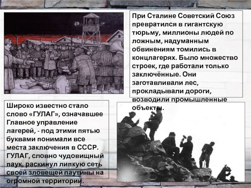 Широко известно стало слово «ГУЛАГ», означавшее Главное управление лагерей, - под этими пятью буквами понимали все места заключения в СССР. ГУЛАГ, словно чудовищный паук, раскинул липкую сеть своей зловещей паутины на огромной территории.