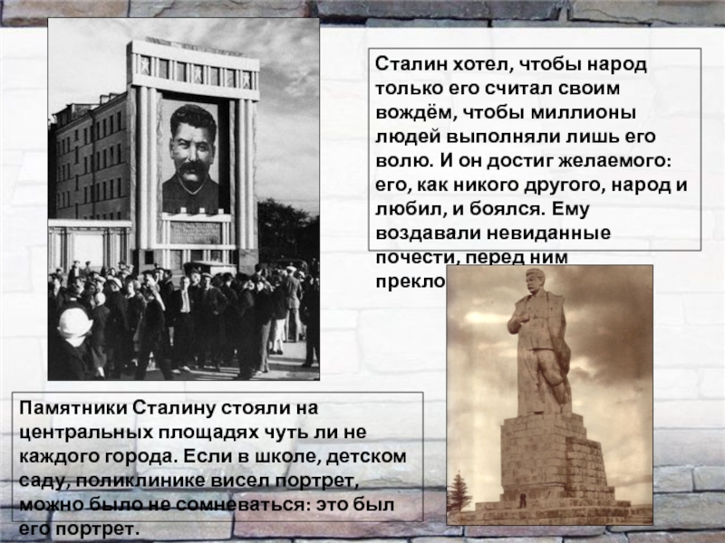 Памятники Сталину стояли на центральных площадях чуть ли не каждого города. Если в школе, детском саду, поликлинике висел портрет, можно было не сомневаться: это был его портрет.