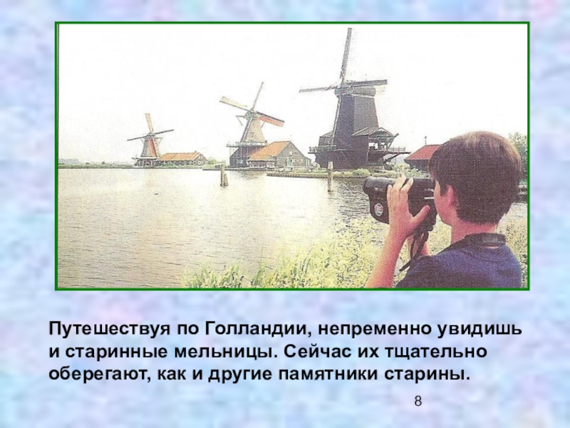 Слайд 8Путешествуя по Голландии, непременно увидишь и старинные мельницы. Сейчас их тщательно