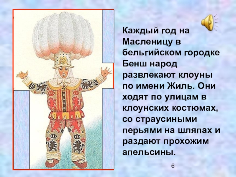 Каждый год на Масленицу в бельгийском городке Бенш народ развлекают клоуны по имени Жиль. Они ходят по