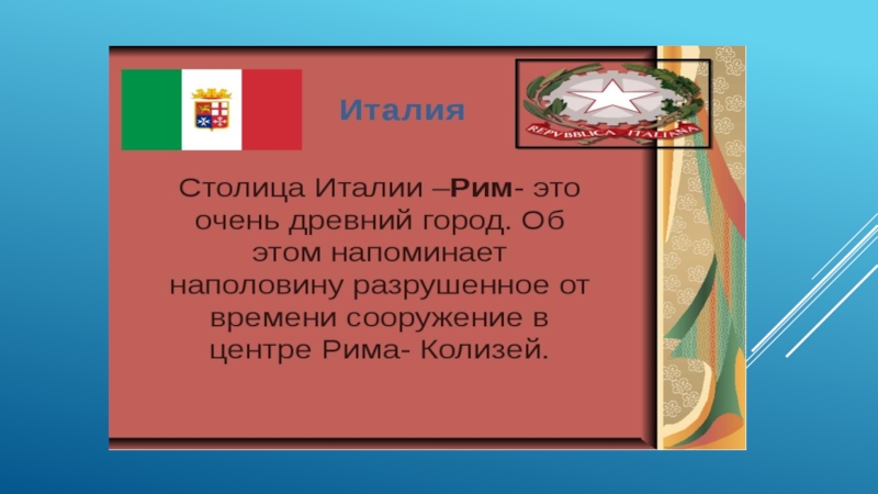 Презентация, доклад по окружающему миру Страны мира Италия Цепло Анастасии