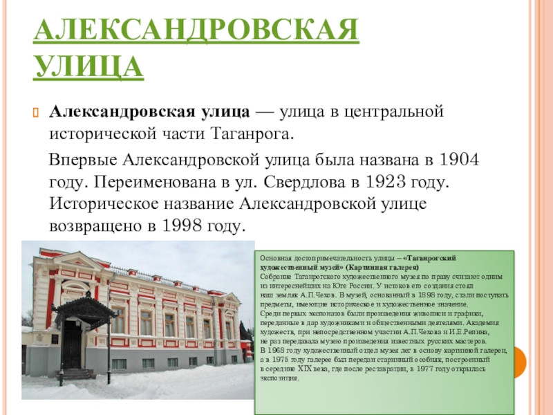 Основная достопримечательность улицы – «Таганрогский художественный музей» (Картинная галерея)